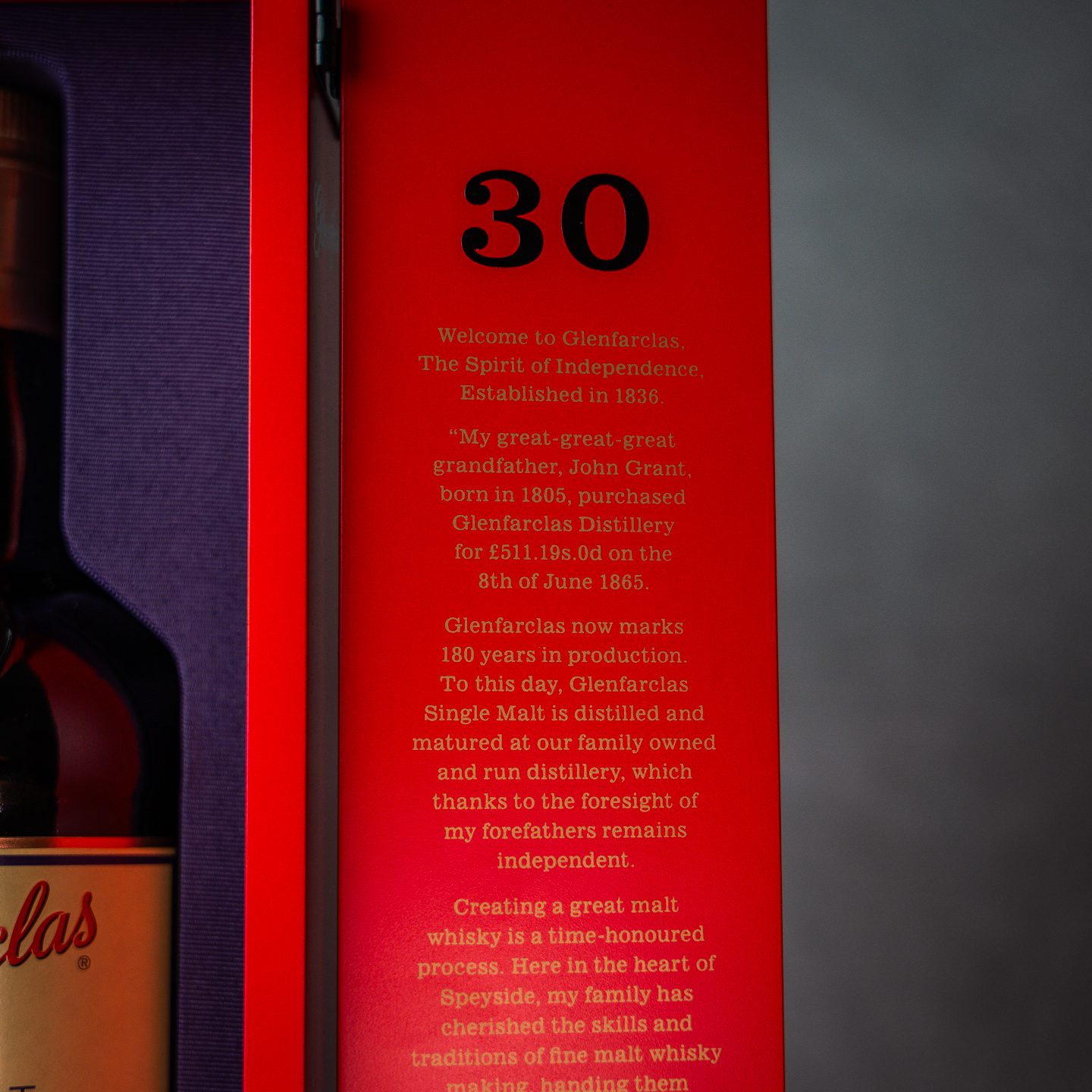 The long awaited expression is to be released in bespoke packaging; a red wooden box designed to recreate the iconic Glenfarclas warehouse doors is presented inside a classic tertiary box. The red doors include a glossy metallic 30 Years Old age statement with Glenfarclas Warehouse stencilling, while the inside of the box reveals a luxurious interior, matching the purple border of the original 30 Years Old label.
