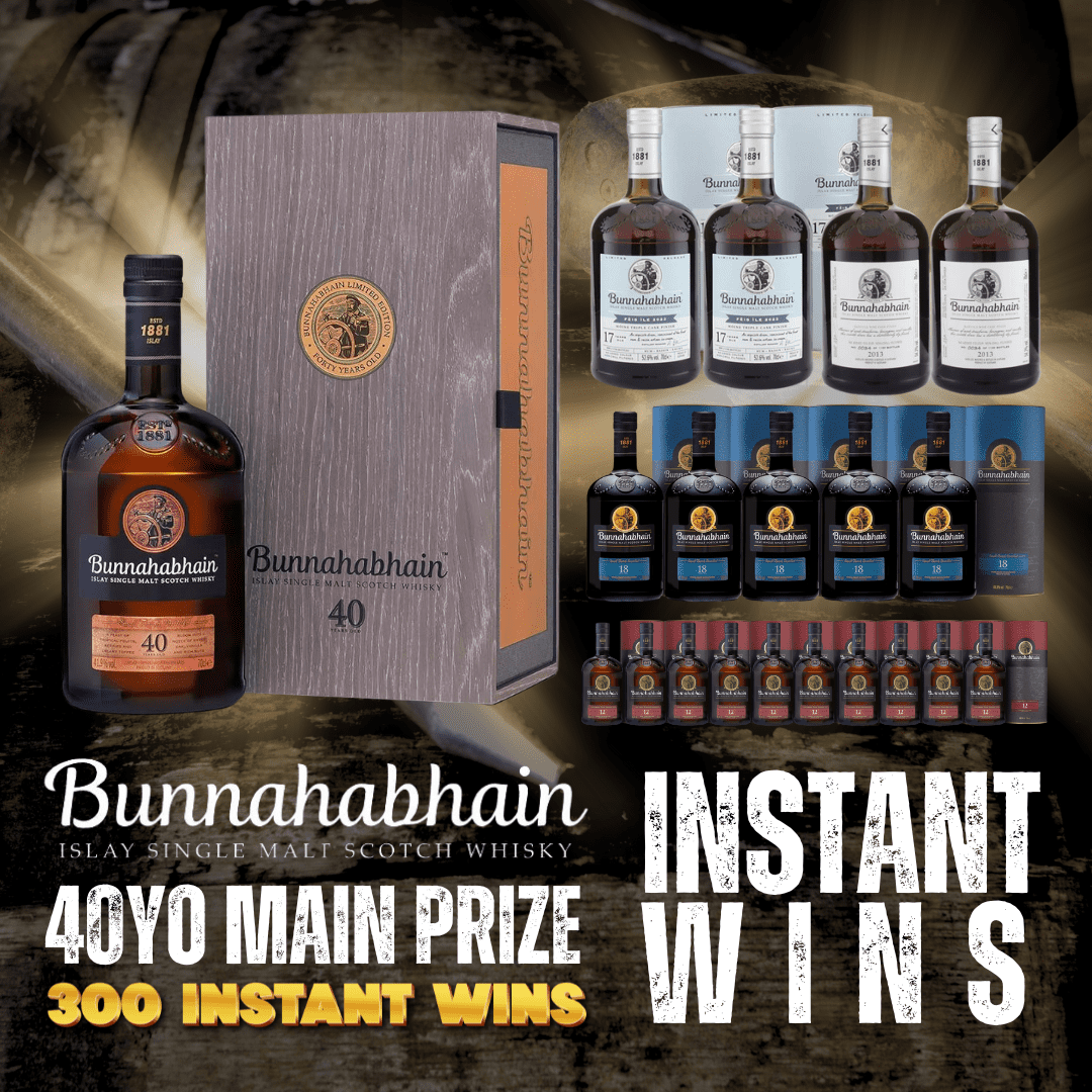 THE BIG BUNNAHABHAIN BELTER! 40YO MAIN PRIZE or £1500 TAX FREE CASH! LOADS OF EXCLUSIVE BUNNAHABHAIN BOTTLES INSIDE 300 INSTANT WINS!