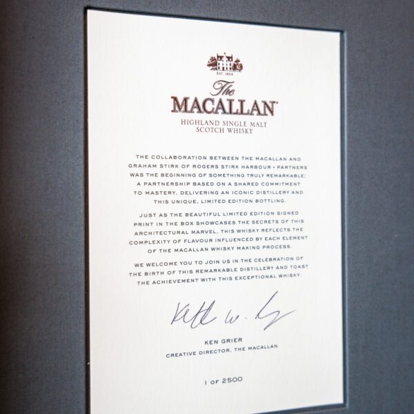 A collaboration with Rogers Stirk Harbour & Partners, who were the architectural firm behind the impressive Macallan premises, the bottle celebrated their design process. Each bottle comes complete with a signed lithographic print depicting and elevation of the building. The print was apparently produced on one of the only two map printing presses in the UK, using cotton paper from the Magnani paper mill in Chiesina Uzzanese, Italy. The quality is such that these are said to never degrade, and will last as long as any unopened bottle!
