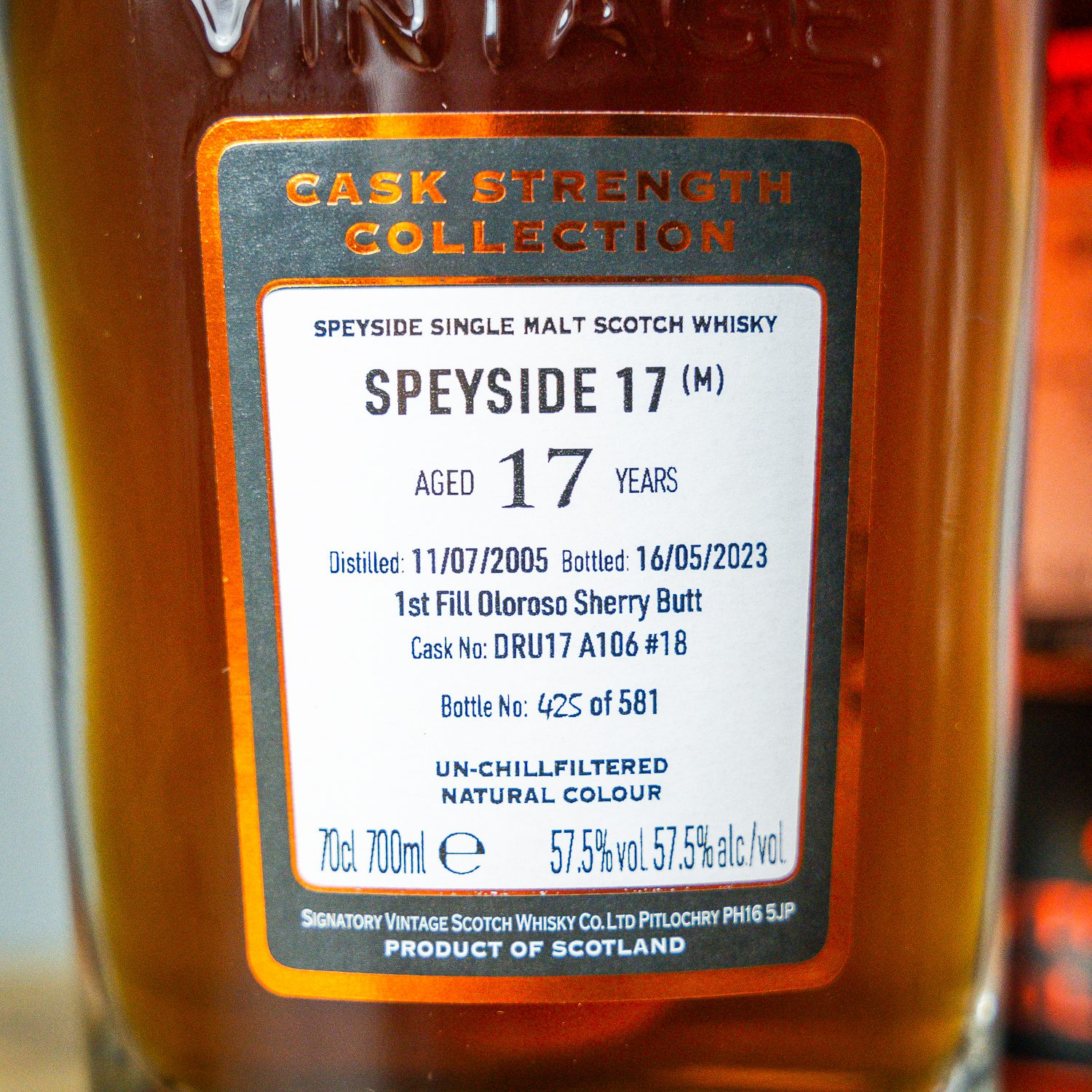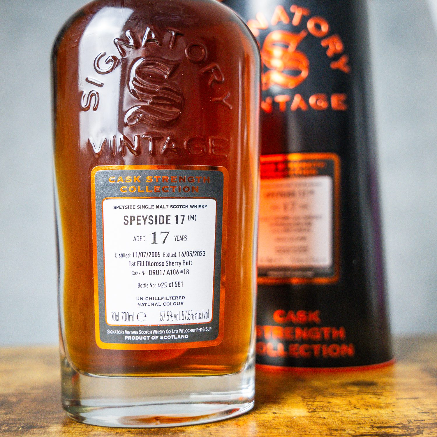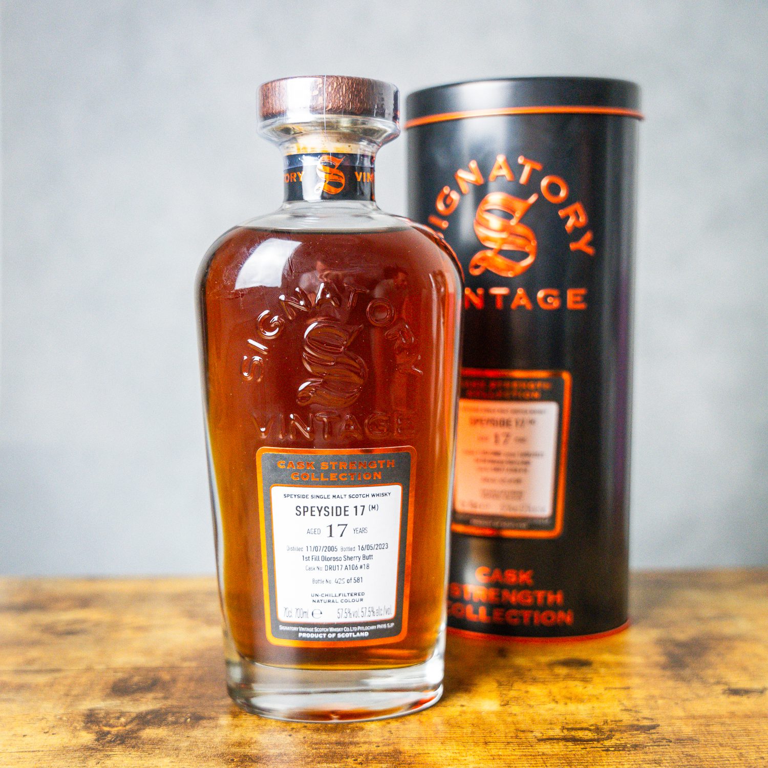 A top secret Speyside single malt from indie bottler Signatory. Distilled in July 2005, the whisky matured for 17 years in a first-fill oloroso sherry butt. The cask was opened in May 2023, yielding a total of 581 bottles for Signatory’s Cask Strength Collection.